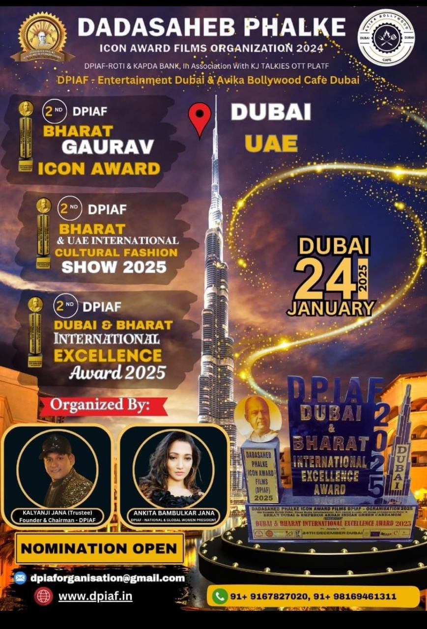 - 24th January 2025 – DPIAF- Bharat Gaurav Icon Award International & DPIAF- *Dubai & Bharat International Excellence Award, alongside a *spectacular DPIAF- Bharat & UAE International Cultural Fashion Show. This will showcase the culture and tourism of India’s 29 states and 7 Union Territories, as well as the 7 states of the UAE. The fashion show will feature ramp walks by models wearing costumes representing different states of India, complemented by folk songs celebrating India’s cultural diversity.
