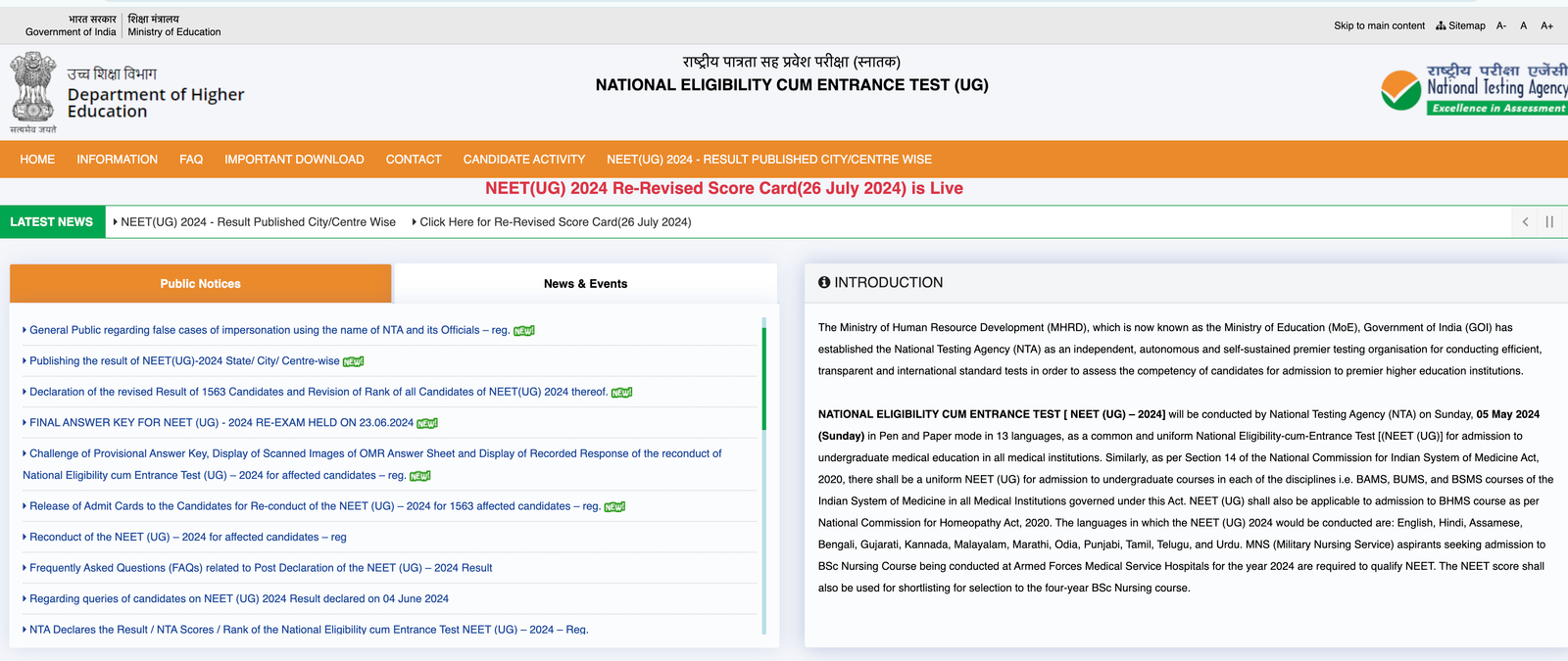 New Delhi, July 26, 2024 — The National Testing Agency (NTA) has officially released the re-revised score card for the National Eligibility cum Entrance Test (UG) 2024. Candidates who appeared for the examination can now access their updated scores through the official NEET website.